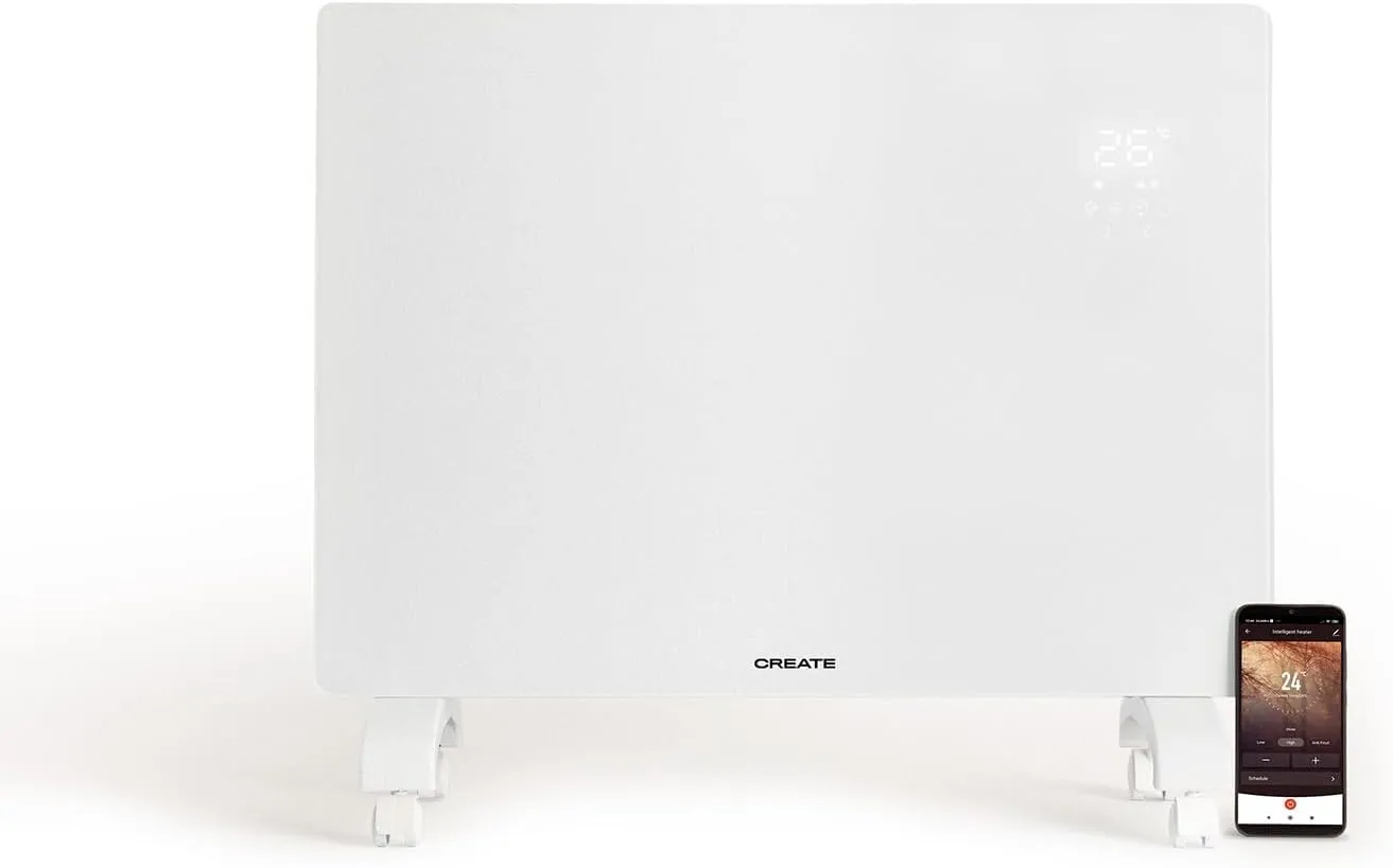 Radiateur Électrique en Verre 1500W avec WiFi et Roulettes, Blanc, Capteurs Intelligents, Minuterie, Économie d'Énergie, Installation Murale ou au Sol, Écran LED
