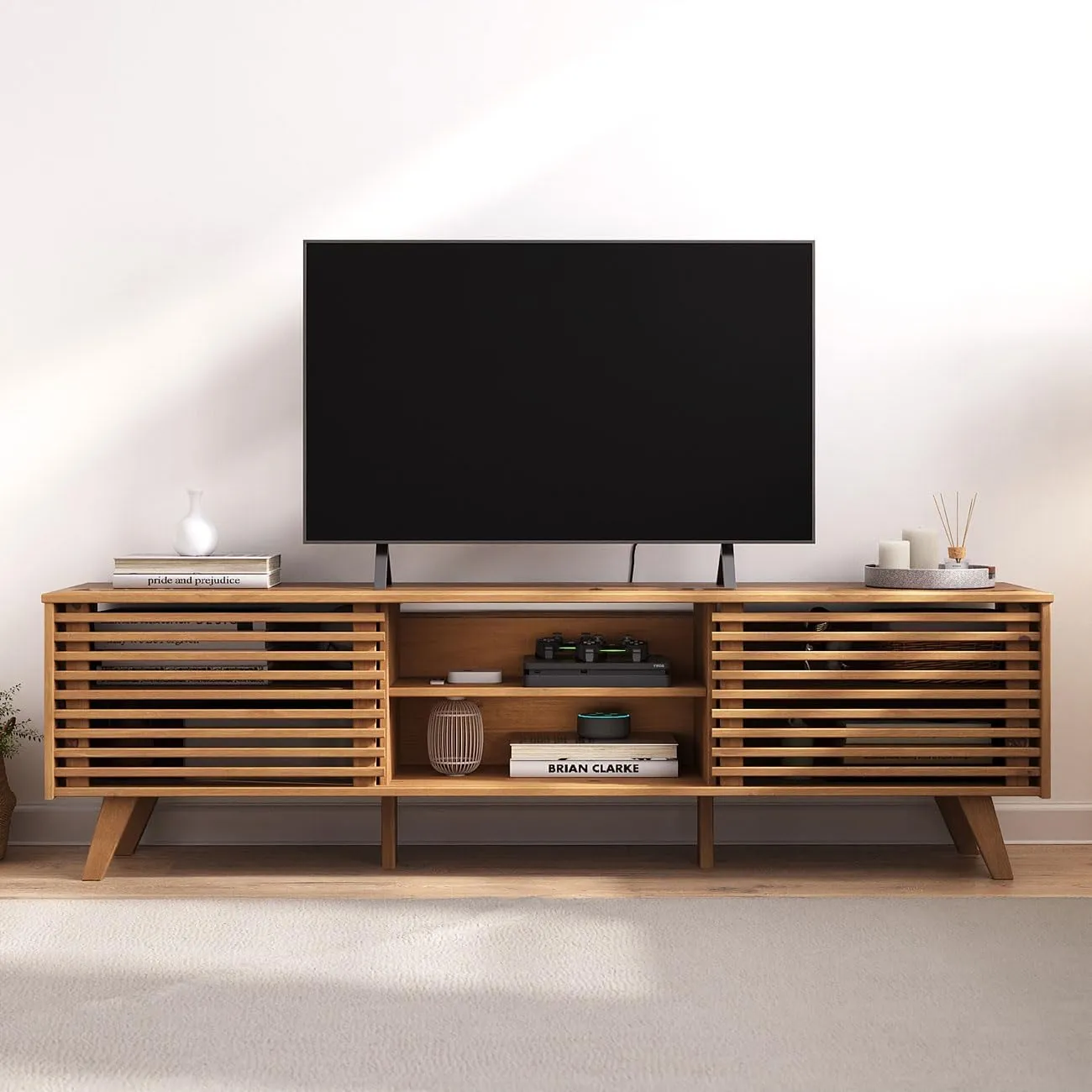 IDIMEX Meuble TV en Bois Massif avec Portes Coulissantes et Étagères Ajustables, Chêne, 175 x 50 x 38 cm, Pour Télévision Jusqu'à 190 cm