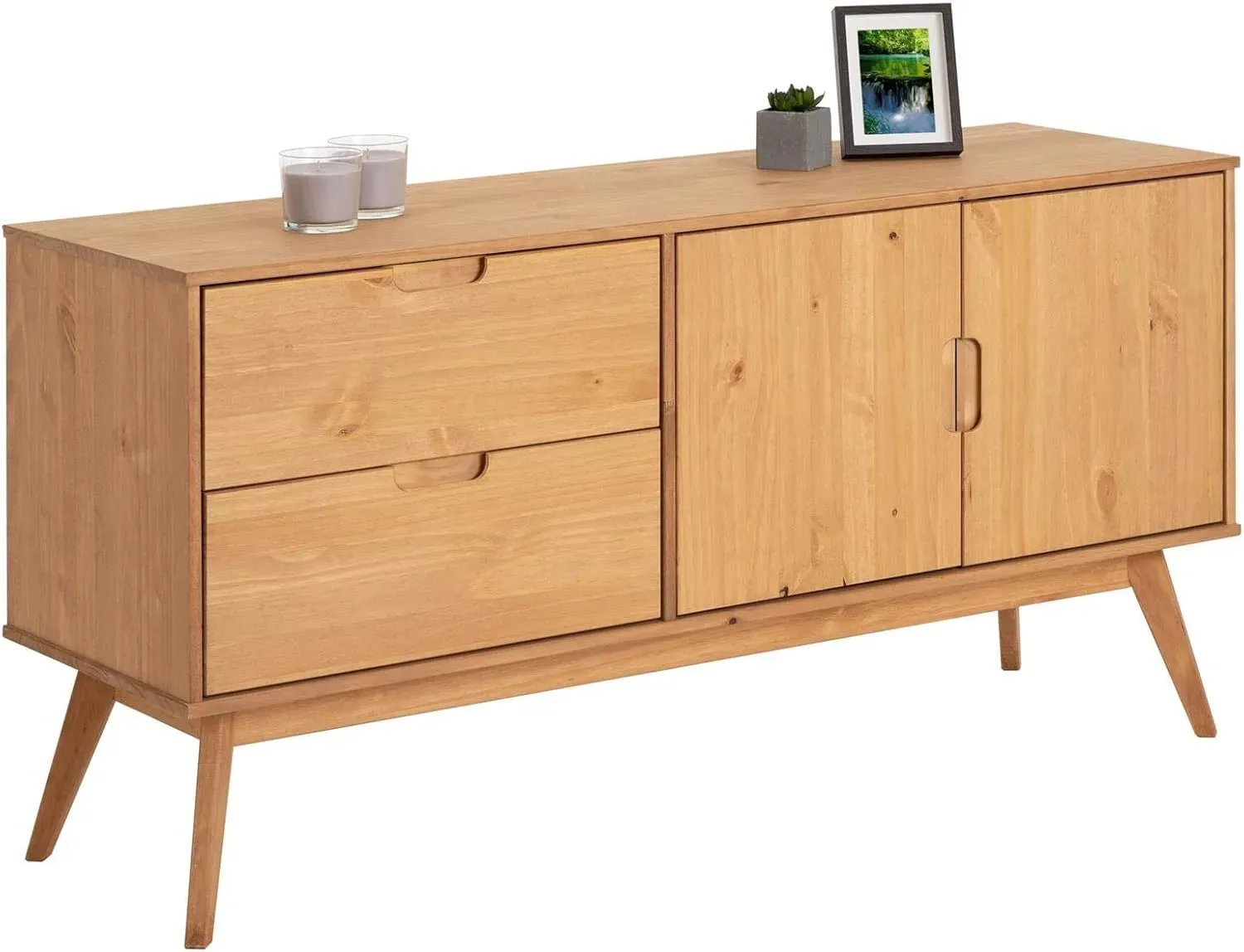 Avec son look vintage au design nordique, ce meuble bas de style scandinave à la finition bois naturel teinté de coloris clair s'intègre dans le salon ou la salle à manger.