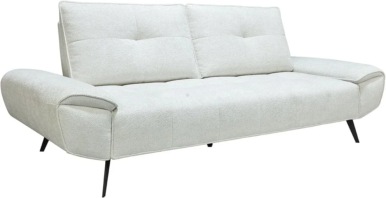 Canapé fixe en polyester blanc avec dossier ajustable. Ce canapé 3 places possède un tissu texturé blanc ivoire et un piètement en métal. Dimensions : L231 x P130 x H88 cm.