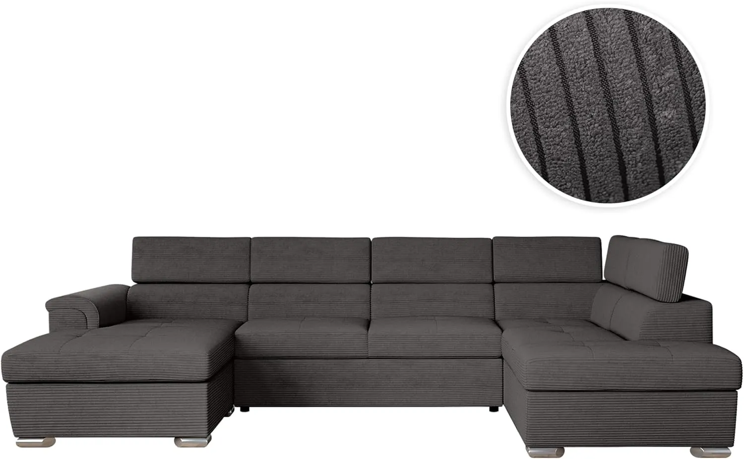 Le canapé panoramique convertible PARMA en velours côtelé est fabriqué en Europe. Ce meuble associe confort et praticité. Convertible, il se transforme facilement en lit pour accueillir des invités grâce à un tiroir lit qui offre un couchage pour 2 places. Le canapé dispose de 2 coffres de rangement intégrés pour optimiser l'espace. Pour un confort optimal, ce canapé propose 6 places spacieuses rembourrées en mousse, chaque place étant dotée d'une têtière réglable. Il est disponible avec un revêtement en velours côtelé pour un toucher doux, ainsi qu'en bimatière en simili et microfibre ou en tissu. Le design panoramique favorise une ambiance conviviale, adaptée aux moments en famille ou entre amis. Les lignes épurées et modernes du PARMA s'intègrent facilement dans un intérieur contemporain. Ce canapé est le résultat d'un savoir-faire européen, alliant qualité et durabilité.