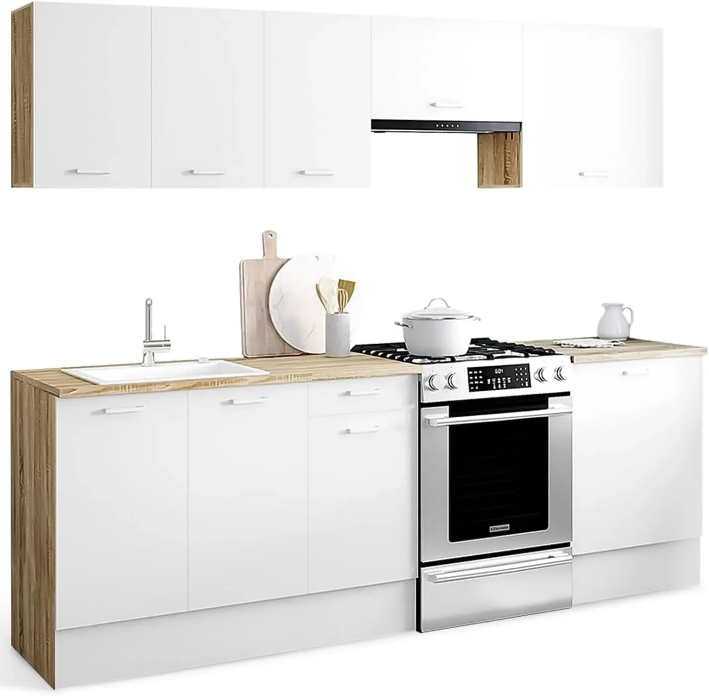 Ensemble de Cuisine 240 cm Subtil avec Plan de Travail, 7 Meubles en Bois et Blanc