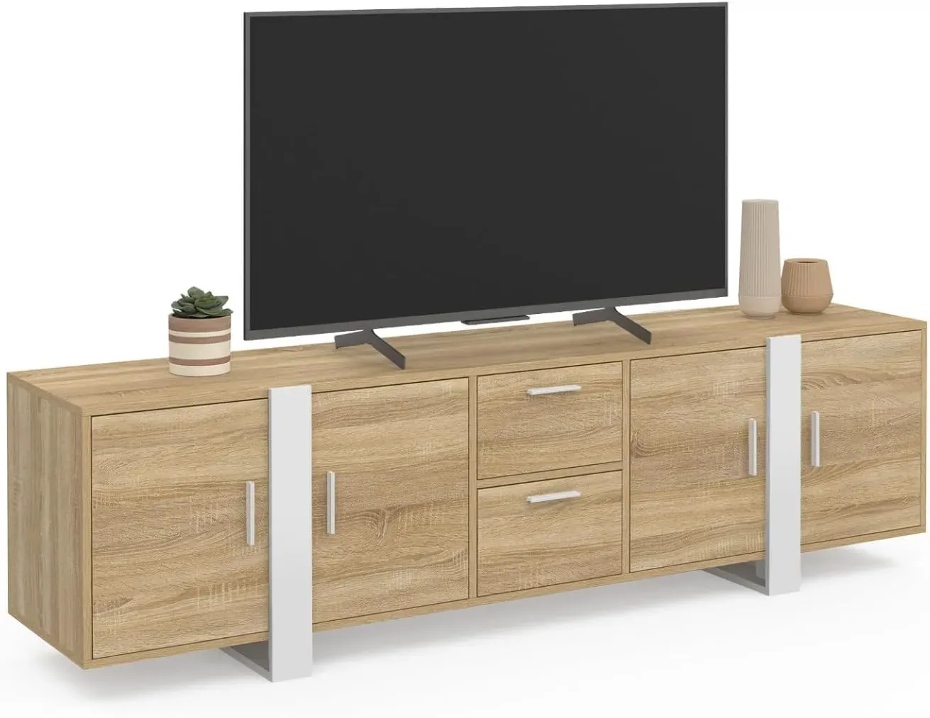 Le meuble TV PHOENIX en bois et blanc de 180 cm s'intègre aisément à diverses décorations intérieures. Il est équipé de deux tiroirs et de grands placards pour optimiser le rangement. Le plateau de 180 cm est conçu pour accueillir un écran plat jusqu'à 70 pouces, ainsi que divers objets. Des trous passe-câbles facilitent l'organisation des fils. Les pieds robustes et la structure en particules de bois assurent une bonne stabilité. Dimensions : 180 cm de long, 40 cm de large et 50 cm de haut.