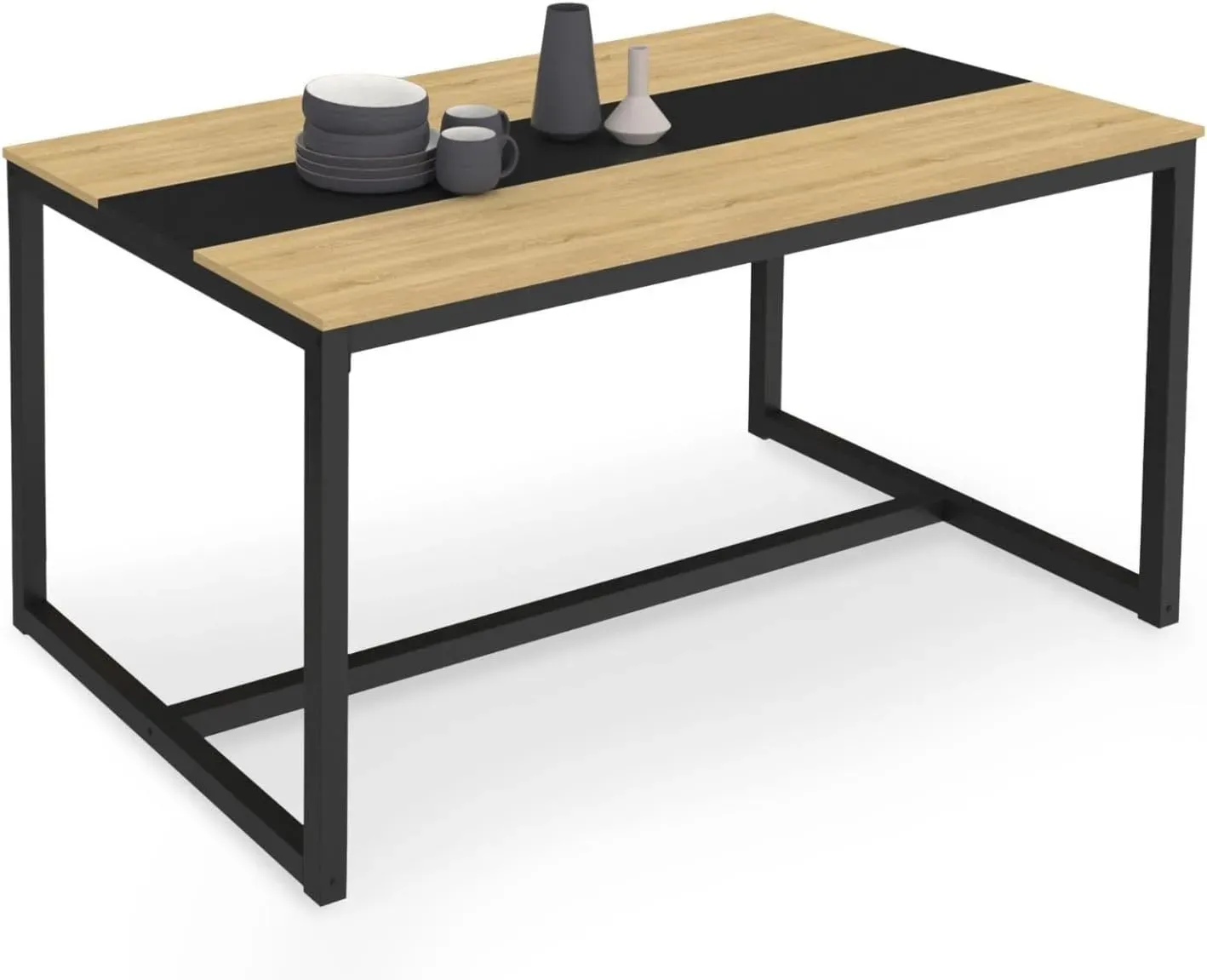 La table à manger DOVER avec bande centrale noire pour 8 personnes combine un style bicolore. Sa longueur de 150 cm accueille jusqu'à 8 personnes. L'association de la couleur bois du plateau et du noir de sa structure donne un aspect industriel à votre intérieur. Le plateau en particules avec structure en métal noir s'adapte à divers environnements. Sa bande centrale noire de 30 cm ajoute une touche esthétique. Sa structure en métal de 4 x 4 cm assure stabilité et robustesse.
