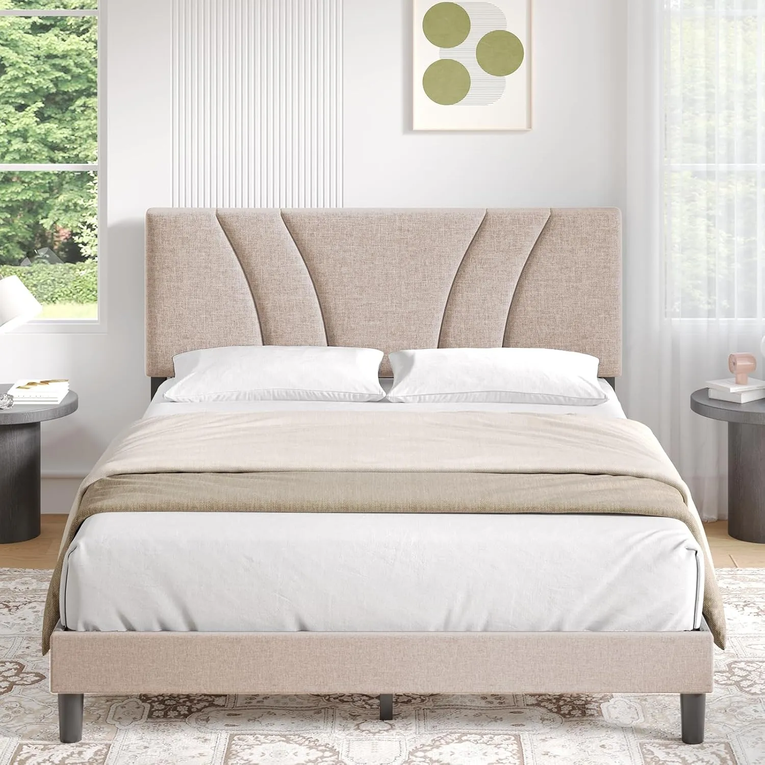 Lit Double Novilla 180x200 cm avec Tête et Pieds Rembourrés, Sommier à Lattes en Bois, Montage Facile, Couleur Beige