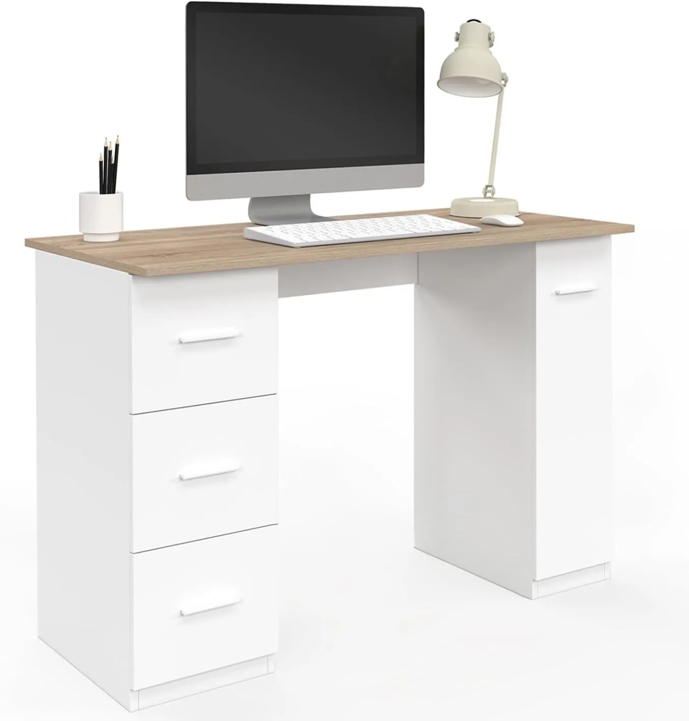 Meuble de Bureau Mae avec 3 Tiroirs et Porte - Blanc et Bois