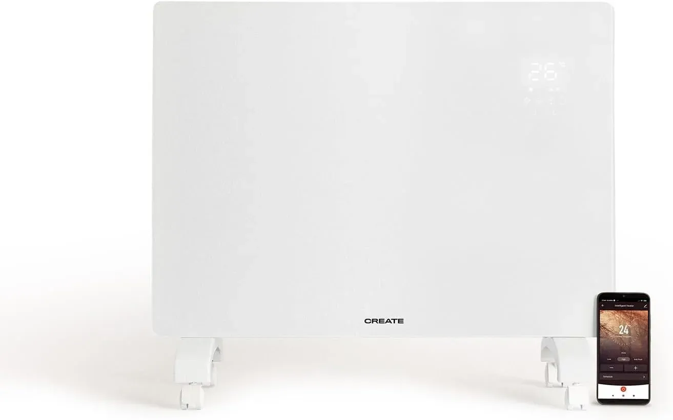 Radiateur Électrique en Verre 1500W avec WiFi et Roulettes, Blanc, Capteurs Intelligents, Minuterie, Économie d'Énergie, Installation Murale ou au Sol, Écran LED